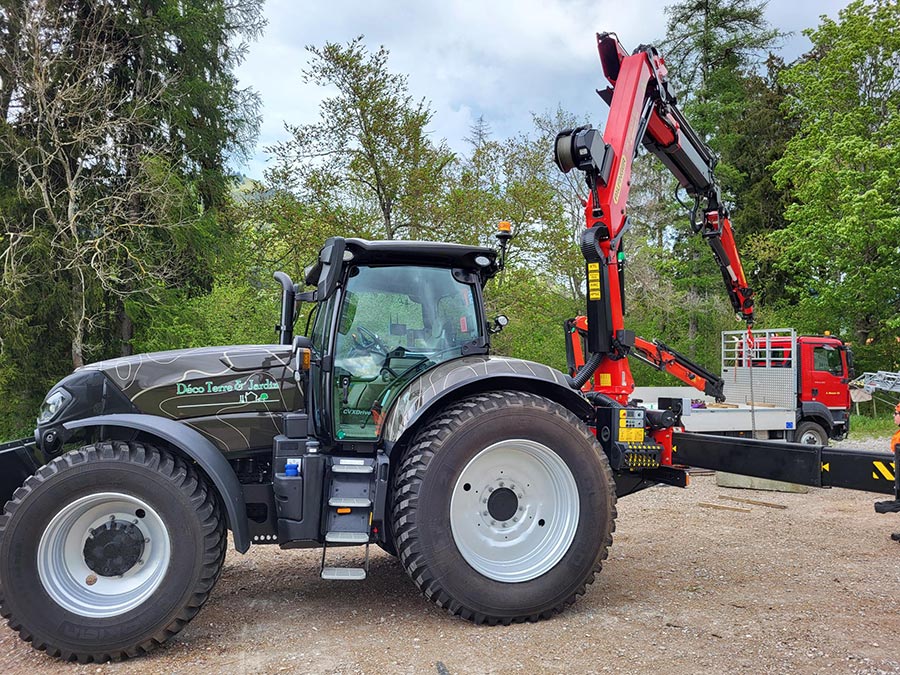 Pour effectuer des travaux de gros oeuvres paysagers, nous sommes équipés d’un tracteur/grue (18 to/m, longueur 25 m), ce matériel est conforme, expertisé et agrée par la Suva. Afin d’y garantir la sécurité, nous manipulons cette grue avec du personnel qualifié
